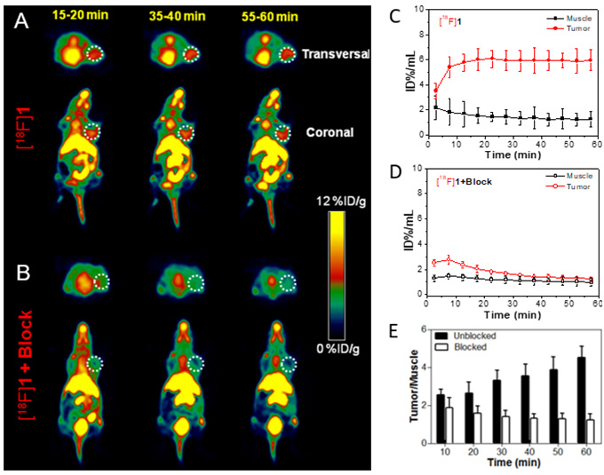 在生物素受體過(guò)表達(dá)的肺癌A549和宮頸癌Hela動(dòng)物模型中,分子探針[18F]1給藥15分鐘后即可獲得高靶本比的PET圖像,60 min時(shí)腫瘤/肌肉靶本比仍大于4;而在生物素受體低表達(dá)的結(jié)腸癌HCT116荷瘤鼠中,探針[18F]1對(duì)腫瘤幾乎無(wú)顯像能力,說(shuō)明該分子探針具有良好的特異性。對(duì)于缺失生物素靶向基團(tuán)或沒(méi)有還原自組裝功能的對(duì)照探針[18F]1a和[18F]1b,難以在生物受體過(guò)表達(dá)的腫瘤中進(jìn)行富集,說(shuō)明腫瘤靶向和自組裝協(xié)同策略可有效提高PET分子探針的顯像效果。該策略對(duì)設(shè)計(jì)發(fā)展新一代核素靶向診療藥物具有重要的參考價(jià)值。