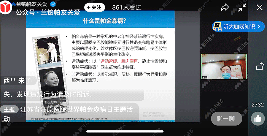 授課專家們圍繞帕金森病全程管理、手術前后常見問題、患者跌倒預防、初確診患者個體化治療方案等方面開展講授。結合患者臨床癥狀,生動講解了帕金森病的運動癥狀和非運動癥狀,運用視頻展播的方式,重點強調了“早發(fā)現(xiàn)、早診斷、早治療”的健康管理理念,鼓勵患者積極堅持全程治療,提高生活質量。本次線上公益直播活動,共計近2000人次參與互動。最后,李建副主任針對在線“帕友”們提出的問題,給出了健康建議。(省江原醫(yī)院內(nèi)科)